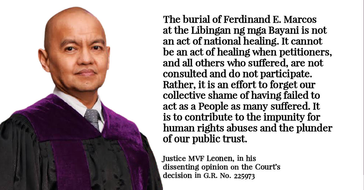 The burial of Ferdinand E. Marcos at the Libingan ng mga Bayani is not an act of national healing. It cannot be an act of healing when petitioners, and all others who suffered, are not consulted and do not participate. Rather, it is an effort to forget our collective shame of having failed to act as a People as many suffered. It is to contribute to the impunity for human rights abuses and the plunder of our public trust.